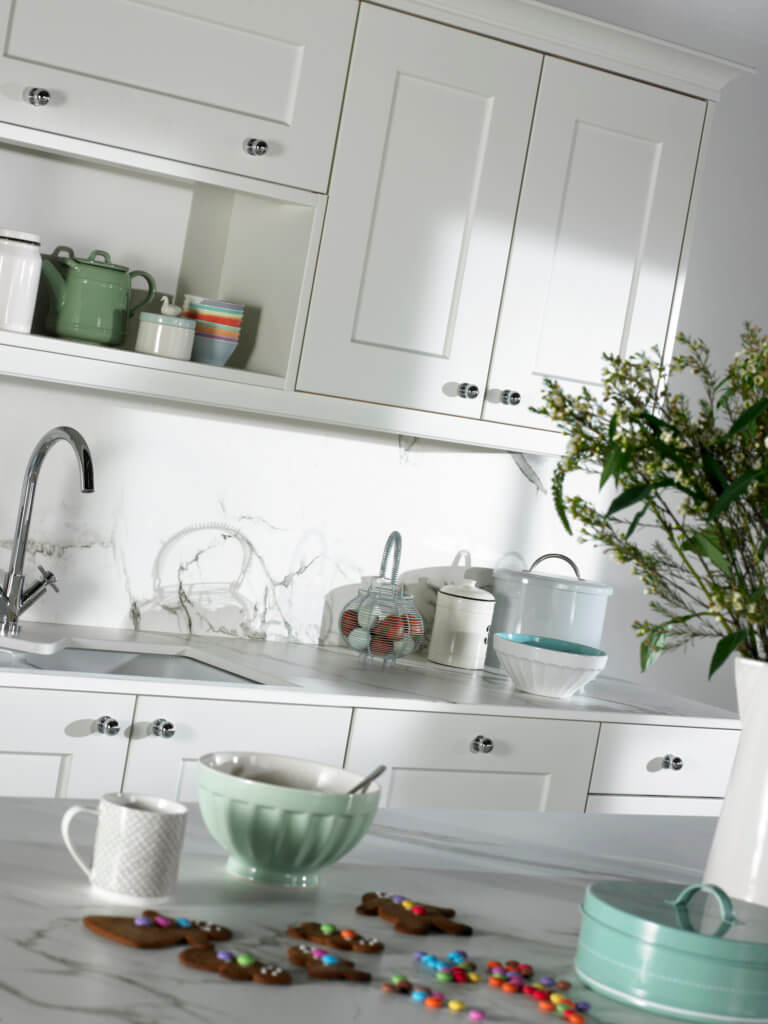 A simple design enhanced with traditional features epitomizes a classic kitchen. This timeless style has stood the test of time and is one of the most flexible themes to create in a kitchen. It’s bevelling on the recessed doors demonstrates elegance and luxury that will give your new kitchen extravagant feel.